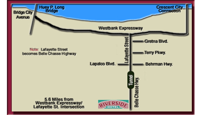 Riverside Hotel is easily accessible from downtown New Orleans, the Belle Chasse Naval Air Station Joint Reserve Base (NAS-JRB) at Alvin Callender Field, the New Orleans Naval Support Activity (NSA) in Algiers and surrounding New Orleans metropolitan areas.